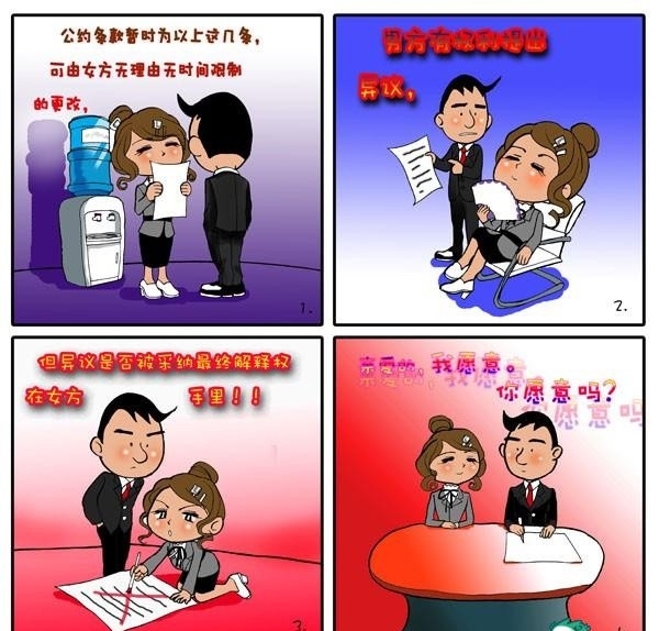 (公约条款暂时为以上这几条,可由女方无理由无时间限制地更改,男方有权利提出异议,但是异议是否被采纳最终解释权在女方手里)