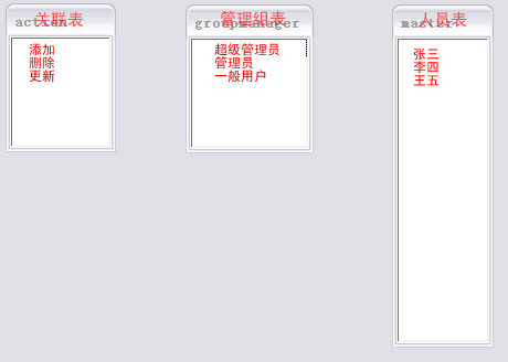 首先,action表(以下简称为“权限表”),gorupmanager表(以下简称为“管理组表”),以及master表(以下简称为“人员表”),是三张实体表,它们依次记录着“权限”的信息,“管理组”的信息和“人员”的信息。如下图: