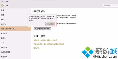 5、选择“停止收集我的信息”选项后,在弹出的对话框里选择“关闭”,至此,市值完毕,再也不用担心小娜会自启扰人了。